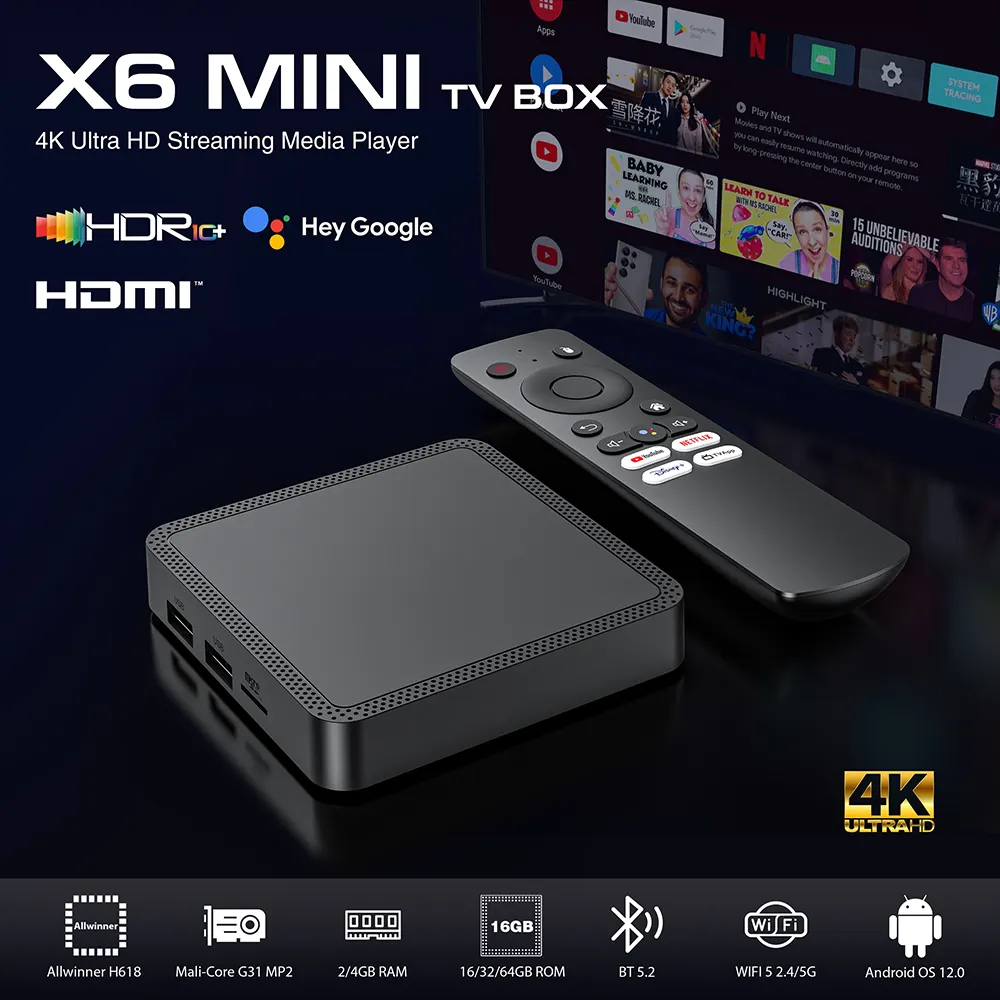 Upgrade your home entertainment experience with the X6 Mini Android TV Box, a powerful and compact device designed to transform your ordinary TV into a smart entertainment hub. Packed with advanced features, this TV box delivers smooth performance, high-definition visuals, and effortless connectivity for a truly cinematic viewing experience at home.
